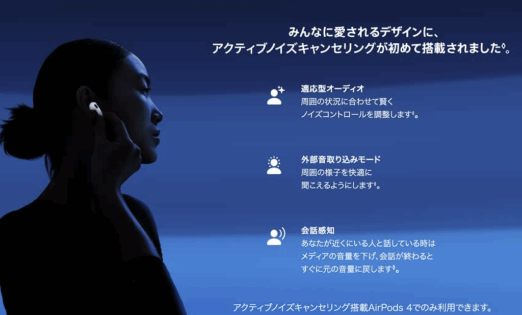 また、AirPods 4の「適応型オーディオ」機能を活用すると、環境に応じてANCの強度が自動調整されるのでおすすめだ。