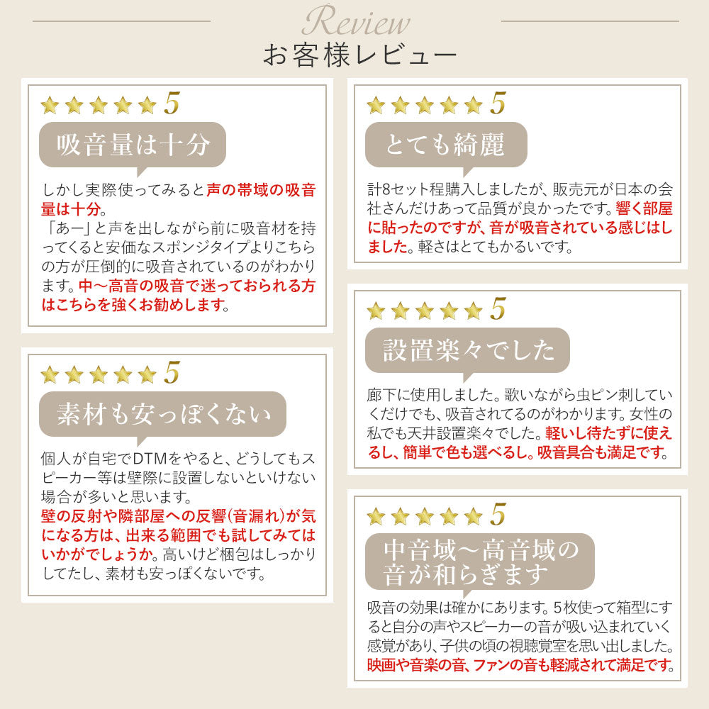 「遮音シートと吸音パネルを併用したが、後付けゆえに期待したほどの完全防音には至らなかった」との声や「製品にゴム臭があったが時間とともに気にならなくなった」といった指摘もありますが、高評価に比べるとごくわずかのレビューとなります