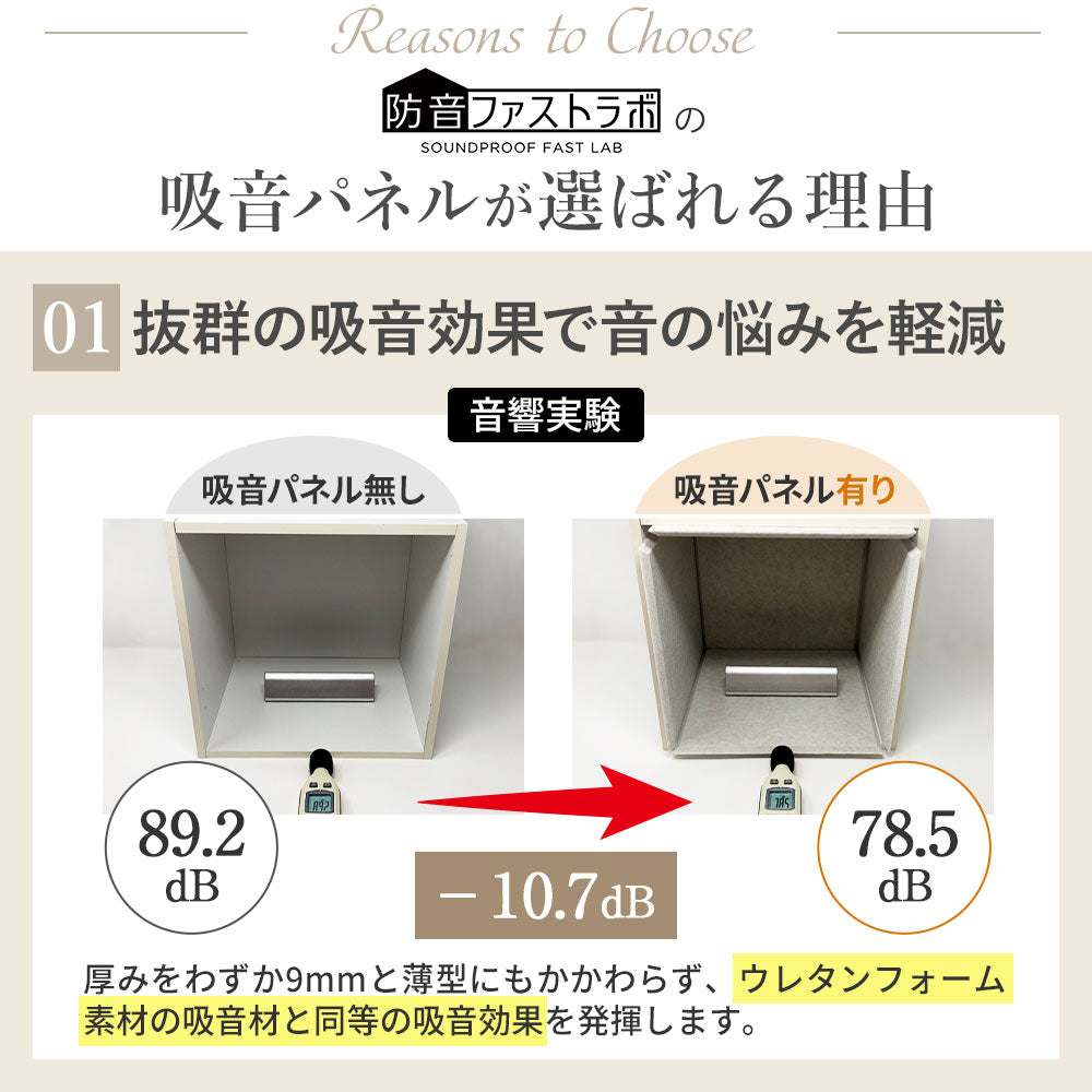 密度200kg/m^3の高密度ポリエステル繊維を使用し、薄さ9mmでもウレタンフォーム並みの吸音効果を発揮!