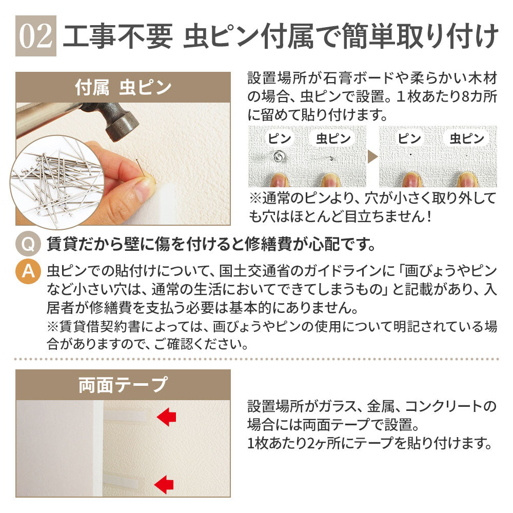 虫ピンや両面テープを使えば、壁紙を傷つけずに設置可能。 - 剥がす時に不安がある方は、スポンジ用の超強力両面テープを使用すると安心。