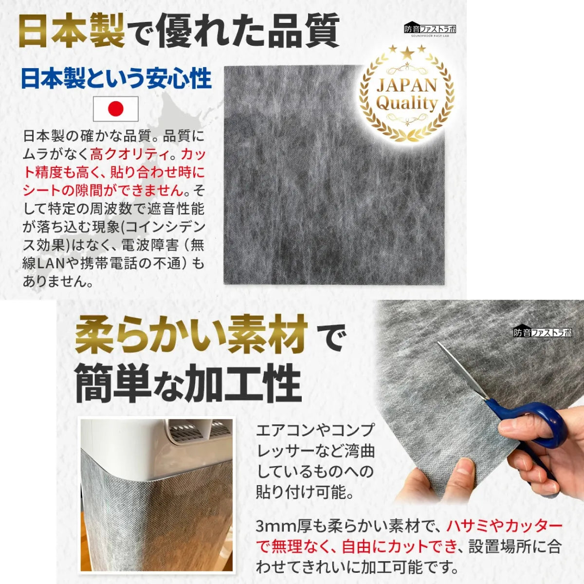 また、このシートはコインシデンス効果(特定周波数で遮音性能が極端に落ちる現象)が起きないよう設計され、無線LANや携帯電話の電波にも干渉ししません。