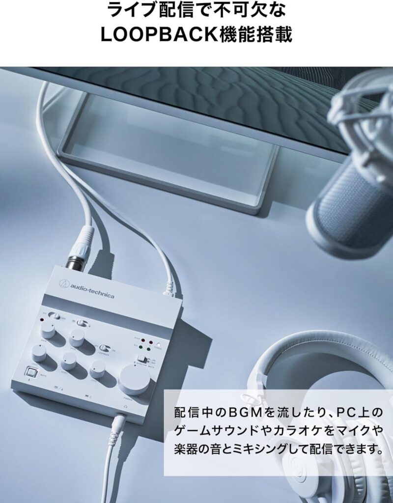 マイク入力やギターHi-Z入力、ループバック機能を備え、PC・スマホ・タブレットに幅広く対応。